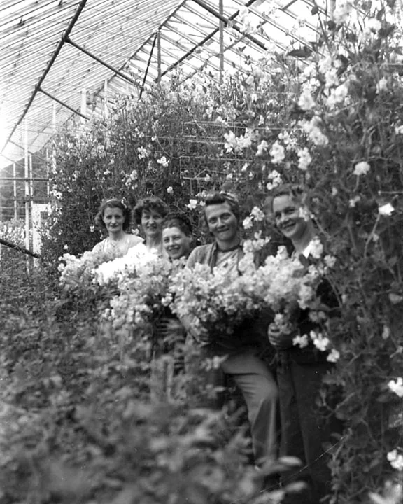 To weather the Depression of the 1930s, they grew popular cut flowers of the era – snapdragons, gladiolus, summer chrysanthemums, sweet peas and violets – as well as houseplants and other exotics. One of the Swanson sons, Ted, recalled his job traveling downtown by streetcar or bicycle to sell cut flowers to florists.